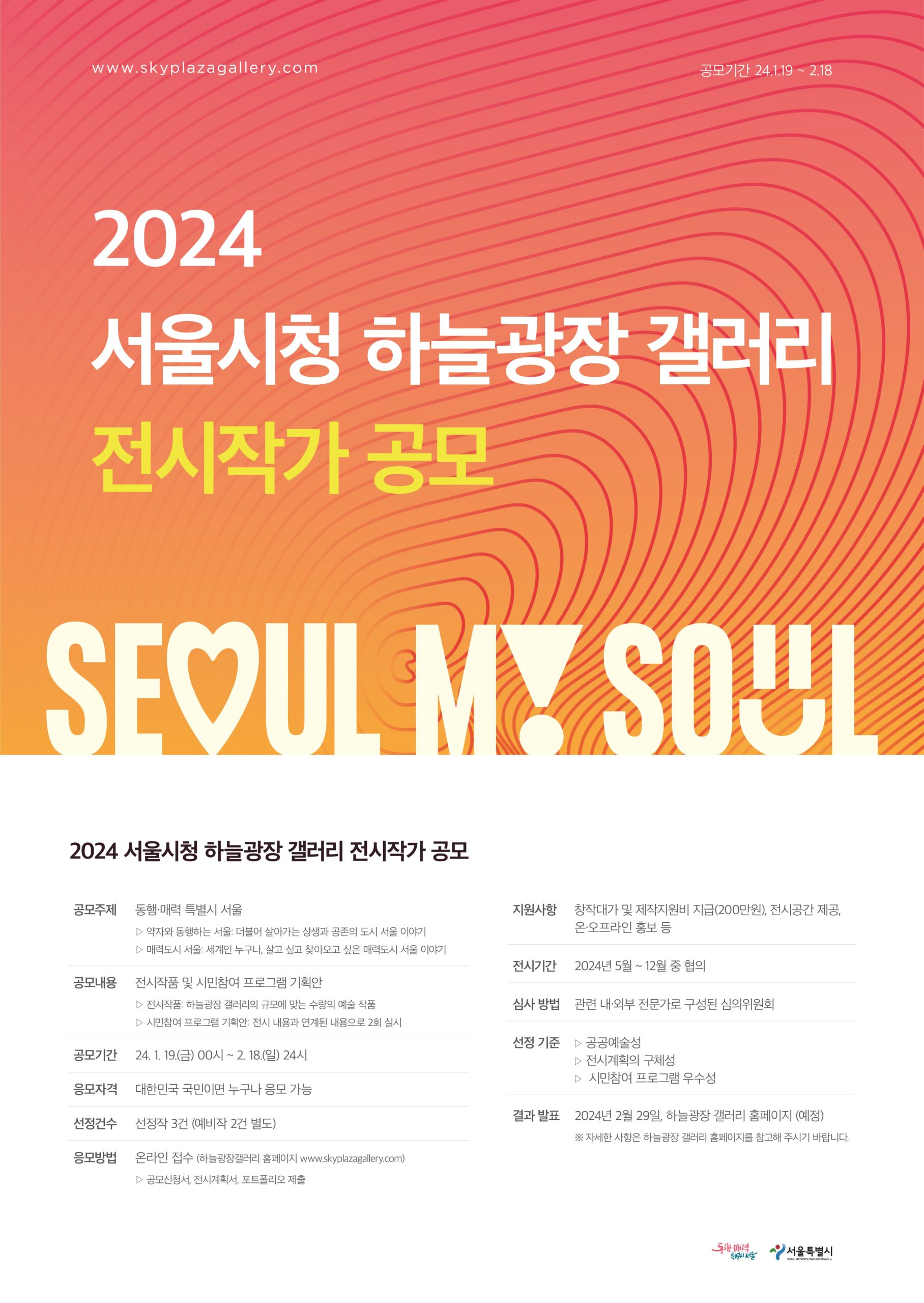 서울시는 오는 1월 19일(금)부터 2월 18일(일)까지 ‘동행·매력 특별시 서울’을 주제로 2024 서울시청 하늘광장 갤러리 전시작가를 공모한다고 밝혔다.