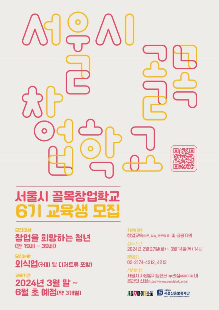 서울시가 골목 상권에 매력과 생기를 더할 청년 창업가 양성 프로그램인 ‘골목창업학교’ 6기 교육생 20명을 모집한다. 2021년 7월 문을 연 ‘서울시 골목창업학교’는 이론교육장과 전문 실습실을 완비한 외식‧식음료‧베이커리 분야 특화 실전형 창업 교육기관이다.