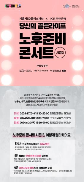 행복하고 안정적인 은퇴 후 인생을 준비하고 싶지만 시간과 정보가 부족해 막막한 4050 중장년 세대를 위해 서울시50플러스재단과 KB국민은행이 ‘노후준비 콘서트 시즌3’를 개최한다.