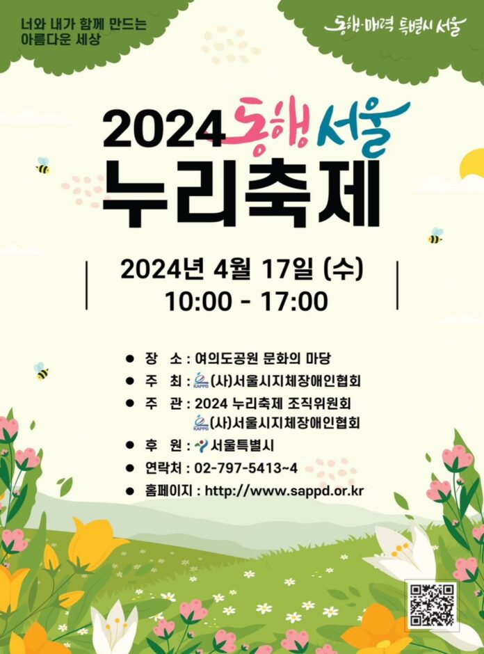 ‘2024 동행서울 누리축제’는 17일(수) 여의도공원에서 개최된다. 축제에는 장애인과 유관 단체, 장애인 복지관, 사회적 기업 등이 참여할 예정이며 일반 시민도 함께 참석해 즐길 수 있다.