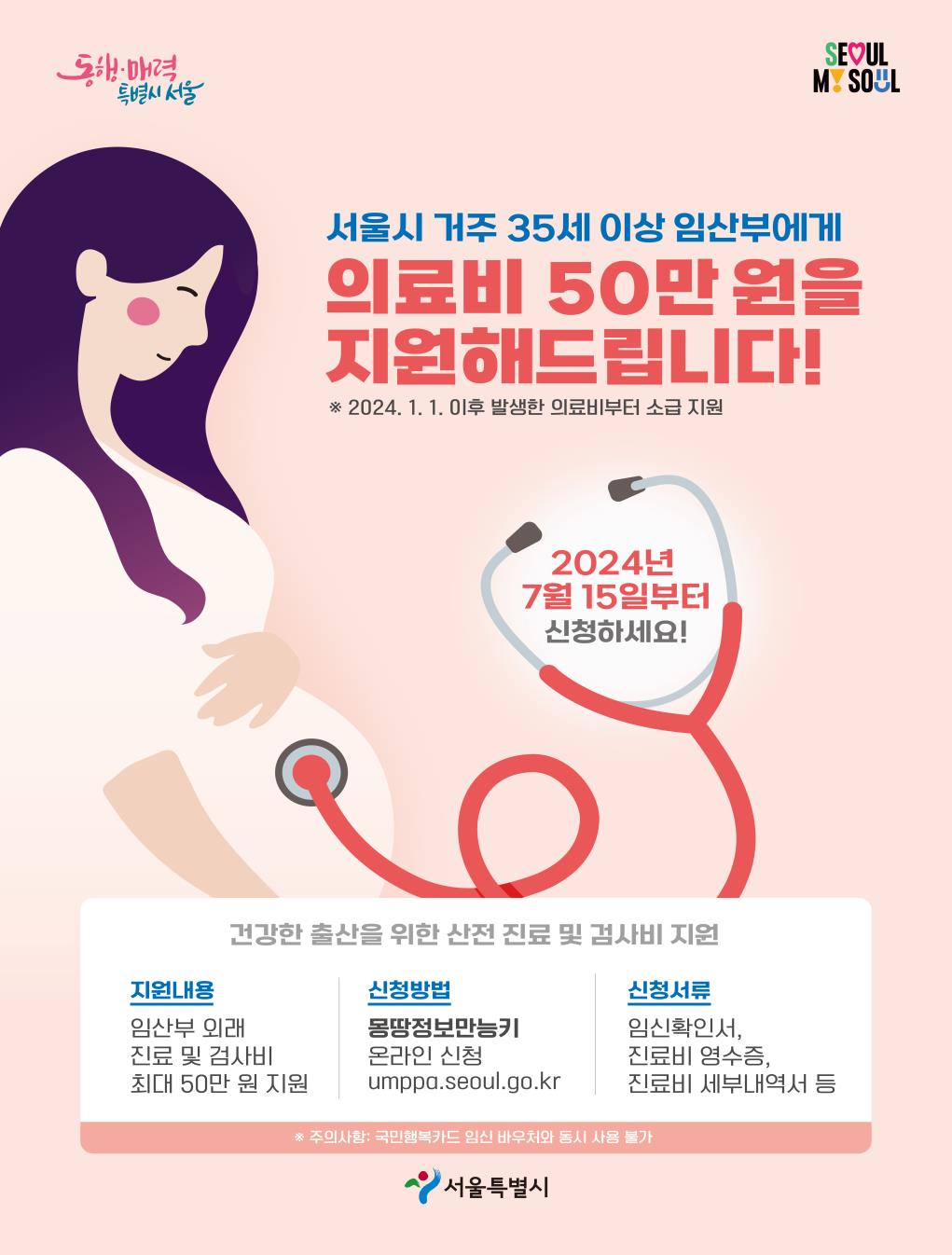 서울시는 서울에 거주하는 모든 35세 이상 임산부에게 최대 50만 원의 산전 의료비를 지원하는 ‘35세 이상 임산부 의료비 지원사업’을 시작한다고 밝혔다.