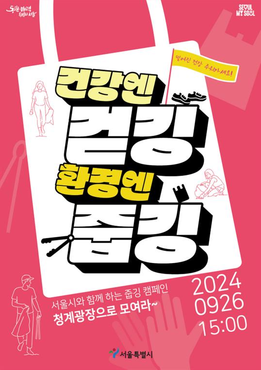 서울시는 줍깅 주간(9.23.~9.28.)을 맞이하여 9월 26일(목) 오후 3시부터 청계광장에서 시민, 학생, 단체, 기업 등 200여 명과 함께 <건강엔 걷깅, 환경엔 줍깅, 떨어진 건강 주워가세요!>를 주제로 제1회 줍깅 캠페인을 진행한다.