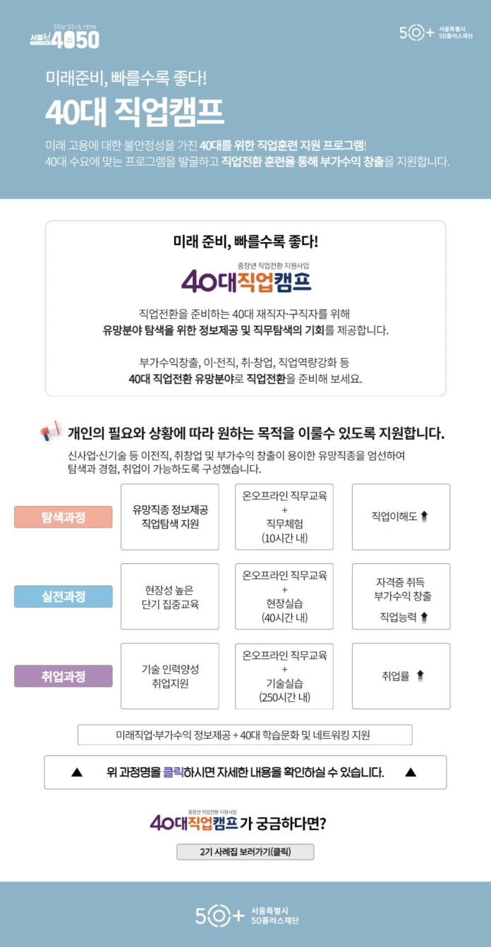 서울시가 40대의 고용 불안을 해소하고 미래 사회에 대비할 수 있도록 ‘40대 직업캠프’를 대폭 확대 운영한다. 서울시50플러스재단(대표이사 강명, 이하 재단)은 2025년부터 연간 1,200여 명을 대상으로 직업탐색, 실전 역량 강화, 재취업을 지원하는 맞춤형 직업전환 프로그램을 무료로 제공한다고 밝혔다.