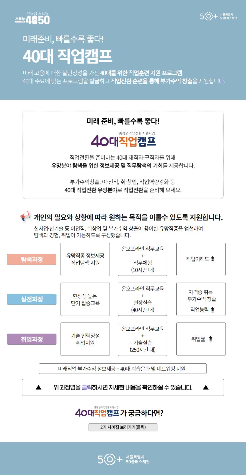 이번 캠프는 직업전환을 고민하는 40대(40~49세) 서울시민 누구나 신청할 수 있으며, 2월 5일부터 50+포털(50plus.or.kr)을 통해 접수하면 된다.