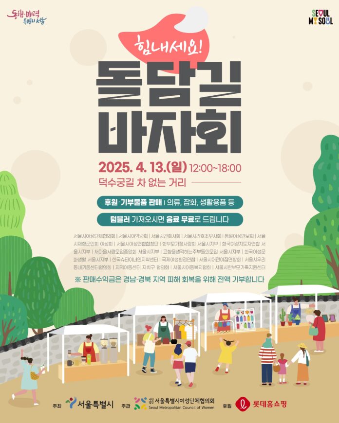 서울시가 지난달 발생한 대형 산불로 인해 삶의 터전을 잃은 이재민과, 큰 경제적 피해를 입은 지역사회에 도움을 주기 위해 오는 일요일(4.13.) 덕수궁 돌담길에서 ‘힘내세요! 돌담길 바자회’를 개최한다고 밝혔다.