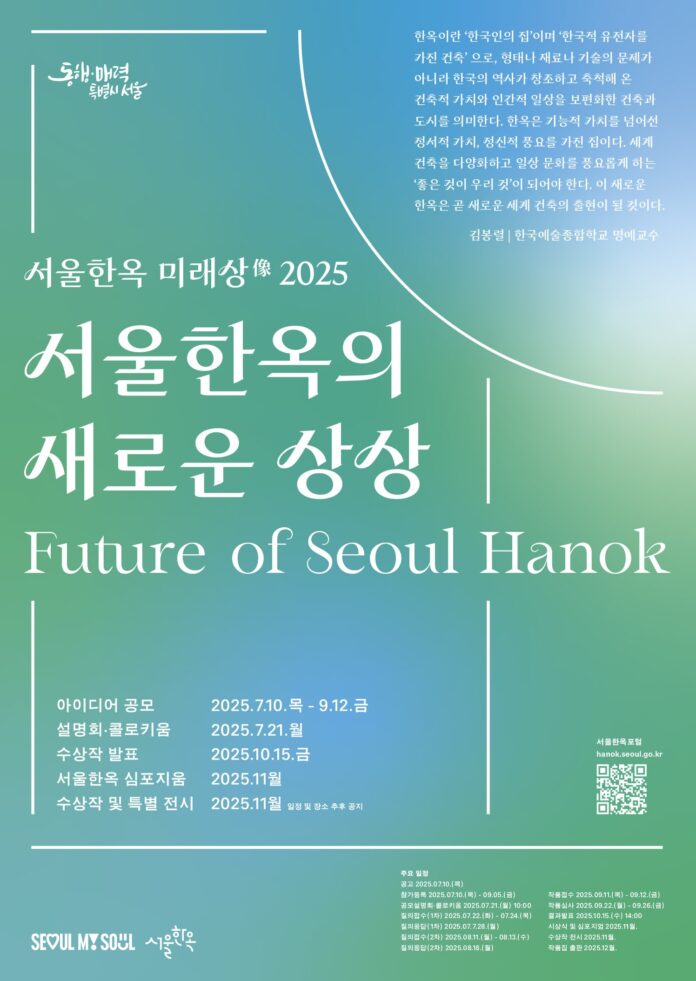 최진석 서울시 주택실장은 “올해 처음 열리는 ‘서울한옥 미래상 디자인 아이디어 공모전’은 단순 설계 공모를 넘어 미래 도시 속 서울한옥의 가능성과 정체성을 함께 상상하고 논의하는 기회가 될 것”이라며 “공모전에서 도시건축 자산으로서 한옥의 확장과 진화를 이끌 창의적인 아이디어가 다양하게 제안되길 기대한다.”고 말했다.